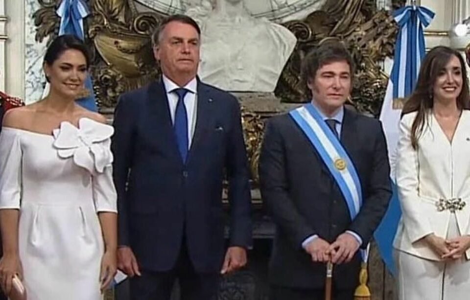 Ex-presidente Jair Bolsonaro e a ex-primeira-dama Michelle Bolsonaro ao lado do presidente Javier Milei, na cerimônia de posse do argentino – Foto: redes sociais.