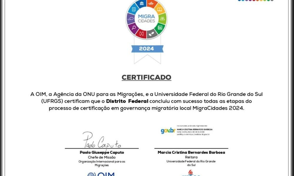 O Distrito Federal (DF) recebeu hoje (16), em cerimônia virtual, o selo MigraCidades. A certificação, concedida pela Organização Internacional para as Migrações (OIM) e Universidade Federal do Rio Grande do Sul (UFRGS), com apoio da Escola Nacional de Administração Pública (ENAP), reconhece iniciativas de governos locais para aprimorar a governança migratória no Brasil, especialmente em ações voltadas para facilitar o acesso de migrantes a serviços públicos de saúde. A Secretaria de Saúde do DF (SES-DF) teve papel preponderante para a certificação.