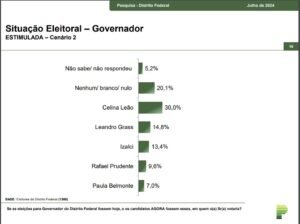 No segundo cenário, a liderança de Celina Leão é ainda mais expressiva, com 30% das intenções de voto. Leandro Grass aparece com 14,8%, seguido por Izalci (13,4%), Rafael Prudente (9,6%) e Paula Belmonte (7%). Nesse contexto, 20,1% dos entrevistados afirmaram que votariam nulo ou em branco, e 5,2% não souberam responder.