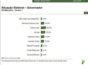 No primeiro cenário, Celina Leão lidera com 22% das intenções de voto, seguida por Arruda com 18,3% e Damares Alves com 14,9%. Outros candidatos, como Leandro Grass (13,2%), Rafael Prudente (6,3%), Paula Belmonte (4,1%) e Coronel Moreno (3,2%), também foram mencionados. Nesse cenário, 14% dos entrevistados afirmaram que votariam nulo ou em branco, e 4% não souberam responder. Vale ressaltar que, até o momento, Arruda não pode se candidatar devido a impedimentos legais.