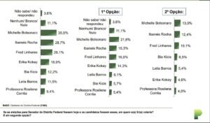 Em pesquisa realizada pelo instituto Paraná Pesquisas, um dos mais conceituados no país, sobre as intenções de votos no Distrito Federal, para as próximas eleições, mostra a atual vice-Governador Celina Leão (PP-DF) na frente, liderando com folga em todos os cenários e Michele Bolsonaro como primeira Senadora e Ibaneis Roca ocupando a segunda vaga para o Senado.