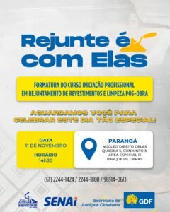 Na próxima semana, Marcela Passamani, secretária de Justiça e Cidadania (Sejus-DF), estará no Paranoá para a entrega de certificados do curso “Rejunte com Elas”. A iniciativa faz parte do Programa Direito Delas, da Sejus, em parceria com o Sindicato da Indústria da Construção Civil do Distrito Federal (Sinduscon-DF) e o Senai-DF.