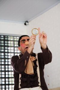 Em seguida é a vez do espetáculo “Seu Cocó e as Caixas-supresa”. E entra em cena Seu Cocó, um palhaço que “toca sem saber que toca” e convida o público a passear por um acervo de incertezas e descobertas: canções inventadas, poesias invisíveis, trava-línguas dançados, adivinhas misteriosas e cantigas de roda. O humor e a brincadeira abrem espaço para que cada criança reconheça seu próprio jeito de perceber ritmos, silêncios e histórias.