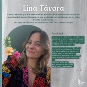Lina Távora, cearense radicada em Brasília, é jornalista, escritora e mestre em Comunicação, com foco em cinema nacional e cinema de intimidade. Desde 2010, atua no Ministério da Cultura, tendo sido editora da revista Filme Cultura (ed. 62 a 65) e produtora da Mostra Carmen Santos (2016). Lina integra o Coletivo Arte Aberta, que discute questões de gênero no audiovisual, e o portal Irmãos Estoicos, dedicado à filosofia.