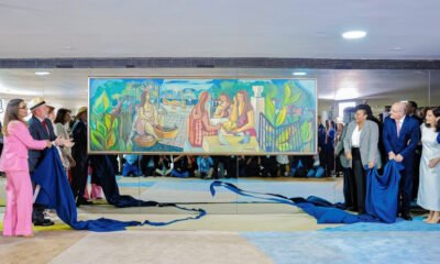 Presidente Lula e vice-presidente Geraldo Alckmin descerram tecido que marca a reintegração do quadro As Mulatas, de Di Cavalcanti, ao acervo da Presidência da República. Foto:...